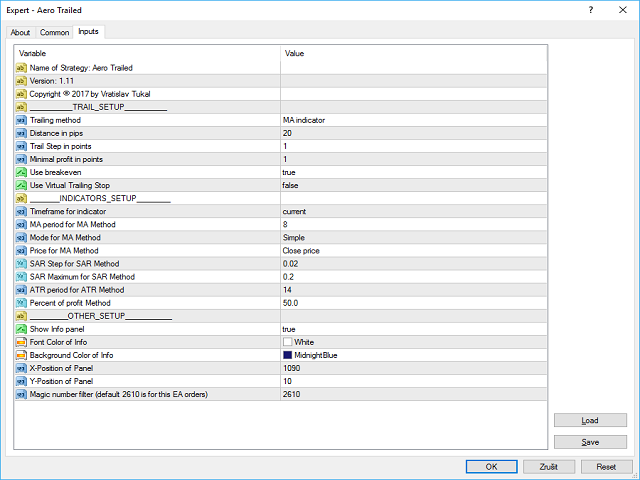 - Trailing method - choose one of the seven algorithms (MA, Fractals, SAR, ATR, Movement of Candlesticks, Profit and Points).