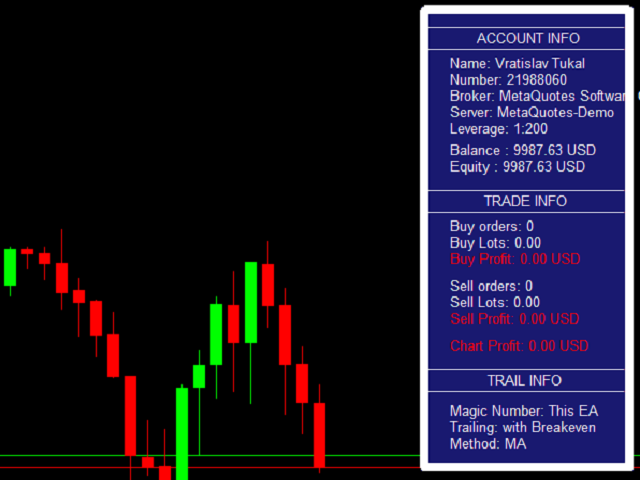 This EA using one of the seven algorithms (MA, Fractals, SAR, ATR, Movement of Candlesticks, Profit and Points) to catch the trend. You can specify a breakeven level to move stop loss of your opened positions.