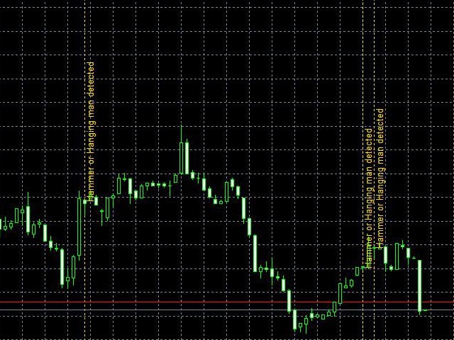 Japanese Candlesticks Monitor scans Japanese candlesticks. It shows a vertical line and a name of a probable candlestick pattern. The indicator is constantly updated, and new patterns are added.