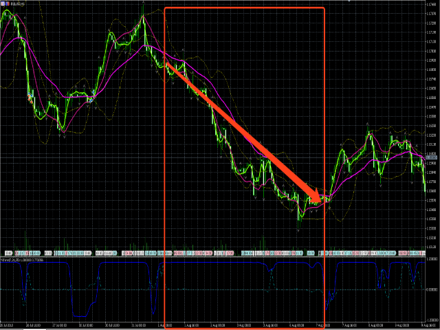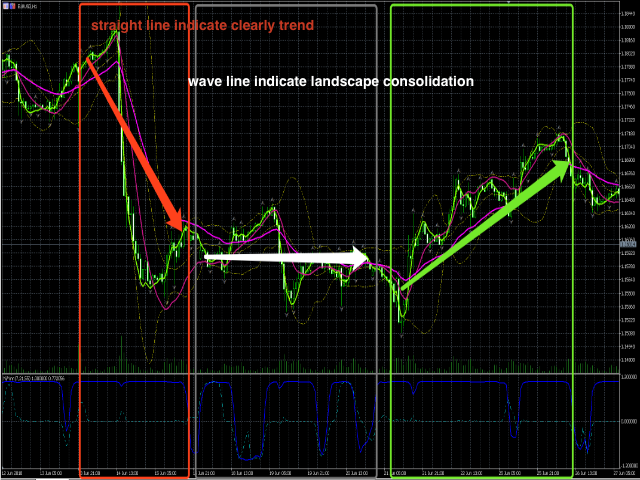 - 指标依据波浪理论,有二阶线性插值模拟组合多条均线(开收高低)构建波浪动力并分析它们各自相关性,所以将对趋势有很好的 预测性 ——与MACD、ATR等相比。它并非只让我们看到趋势的尾巴,请参考最后一张示例图;
