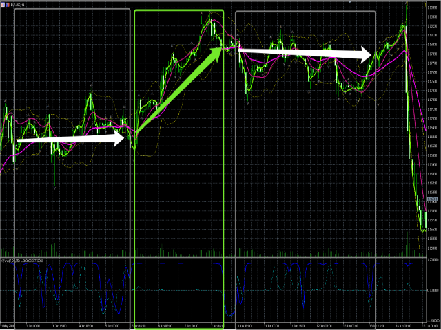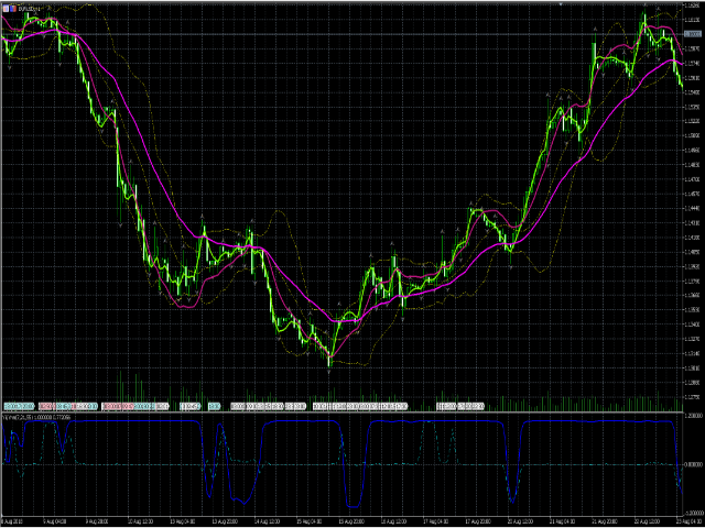 - 当双线都为平稳直线平衡前进时(阳线为1,阴线为0),表明当前价格具有相当平衡的趋势(上涨、下跌、橫盘),可以按观察到的方向开仓即可。如果有合理的通道线辅助,也可以放心开回归的订单;