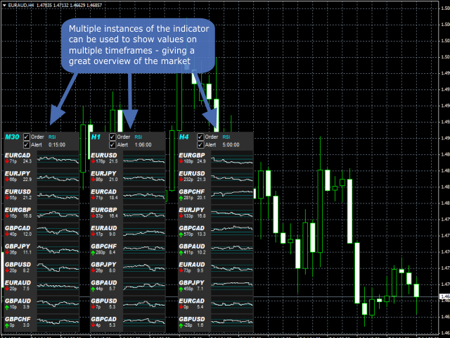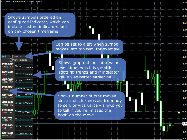 Allows symbols/currency pairs to be ordered based on a configured indicator, with the best performing symbols shown at the top. This helps you to select the symbol with better prospects from a given list of symbols. Can optionally alert when a symbol moves into the top two (configurable). Also shown is the number of pips that the symbol has moved in its current direction, allowing you to tell if you've 'missed the boat'. Further, a graph is shown, per symbol, of the indicator value over time allowing you to spot trends or see if the value was higher earlier. Multiple timeframes can be also shown to give the complete picture.