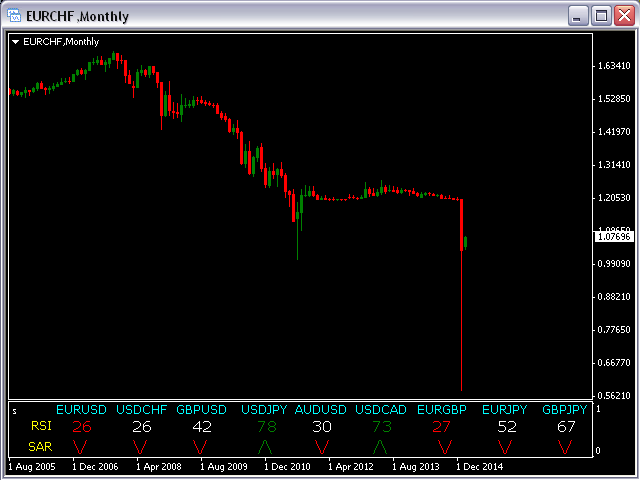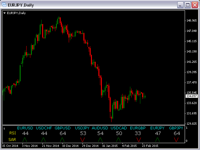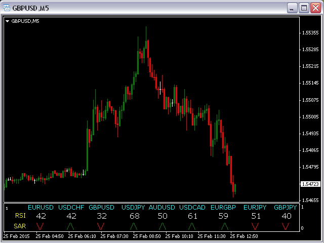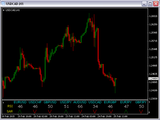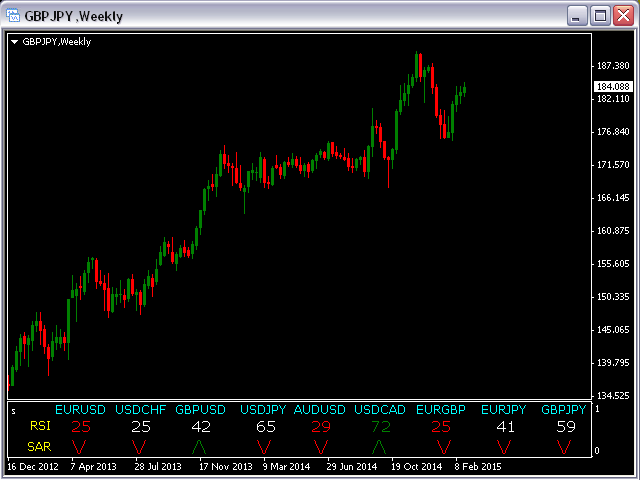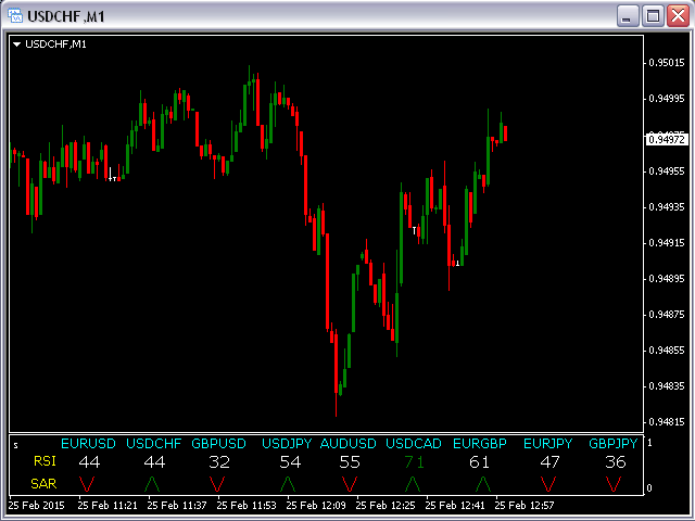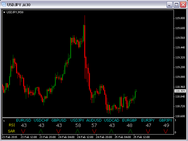 This indicator is based on the classical indicators: RSI (Relative Strength Index) and PSAR (Parabolic Stop and Reverse) and will be helpful for those who love and know how to use not a visual but digital representation of the indicators. The indicator shows values from 9 currency pairs.