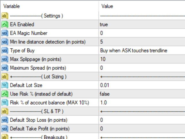 - Breakout distance in pips – Only if the " On distance in pips " option is active, this parameter allows you to define the distance in pips from the trendline for which the EA will consider a breakout.