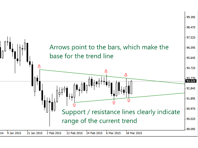 - You can specify on how many bars the indicator shall look in order to identify supporting points.