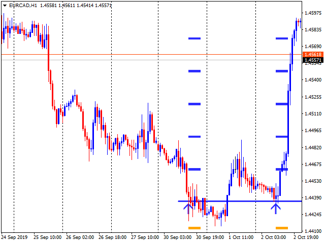 The indicator shows entry points with Risk-Reward-Ratio 1 to 5. Main timeframe H1. Works on every pair. The main logic - is to find a reversal level, and then track the price reaction to this level. Doesn't need any settings. As a standard, it paint 5 levels of the same take-profit (red / blue for sellers and buys) and 1 stop-loss level - orange.