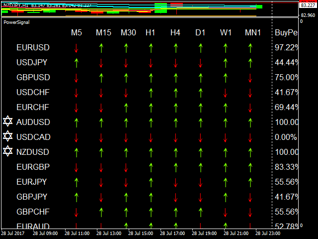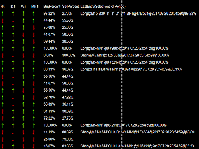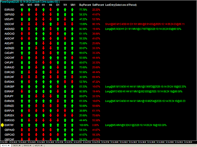 这个PowerSignal是基于ATR技术指标的完整交易系统。该指标将分析并记录每个POWERTREND从M5-MN中每个周期和货币对趋势强度。 PowerSignal通过评估这些数据来创建一个趋势强度和入口点信号列表显示。如果趋势强度百分比达到100,则一个警告会弹出来指示这种情况。当趋势百分比达大于等于75%时认为是强货币,另外LastEntry字段提示选择一个周期入场、显示了多个入场周期,入场价格,时间.通常根据实际情况选择一个中高周期入场比较好。