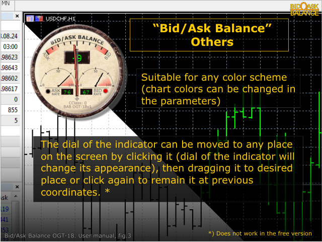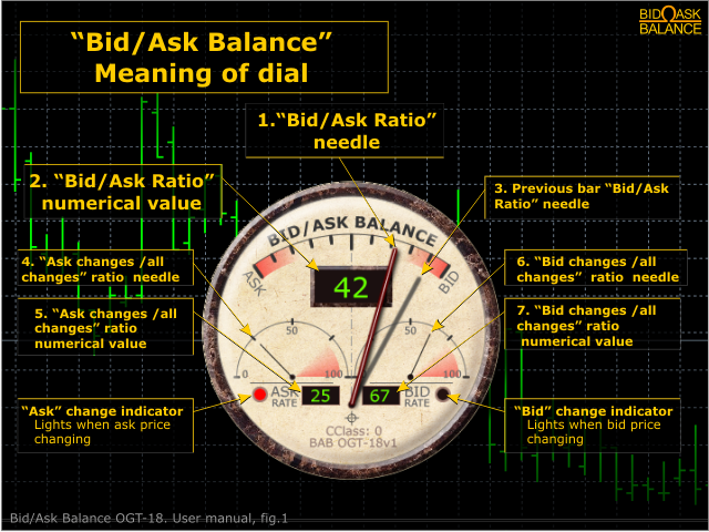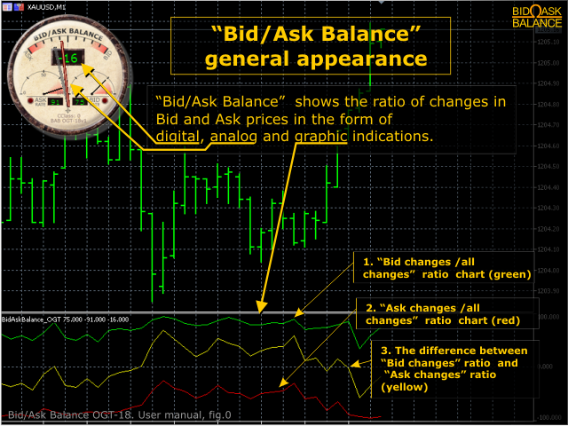 The indicator measures and displays the difference in the number of "Bid" and "Ask" prices changes in the form of digital, analog and graphic indicators.