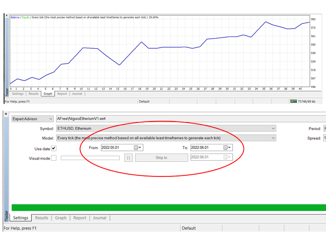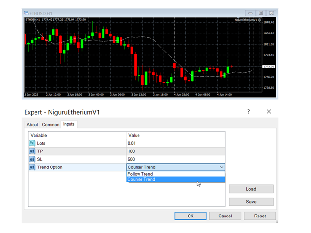 Use this EA with these simple settings to trade Etherium. Choose the M1 time frame for this EA, to get as many trades as possible.