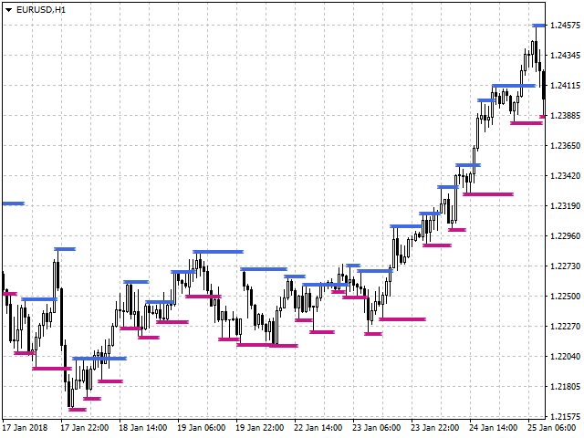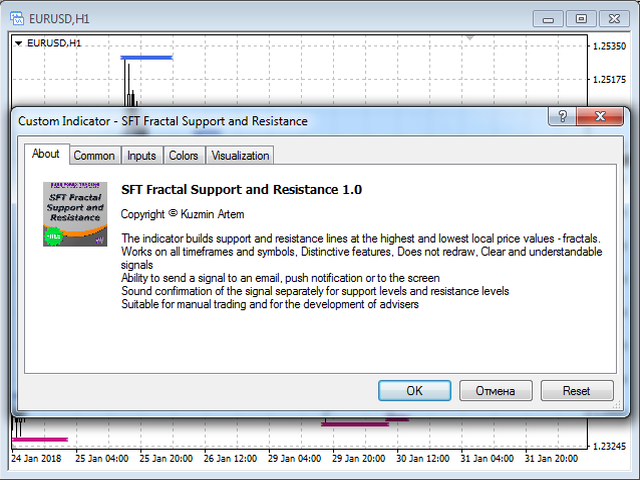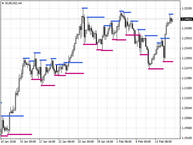 This indicator plots fractal support and resistance lines at the highest and lowest local price values (fractals).