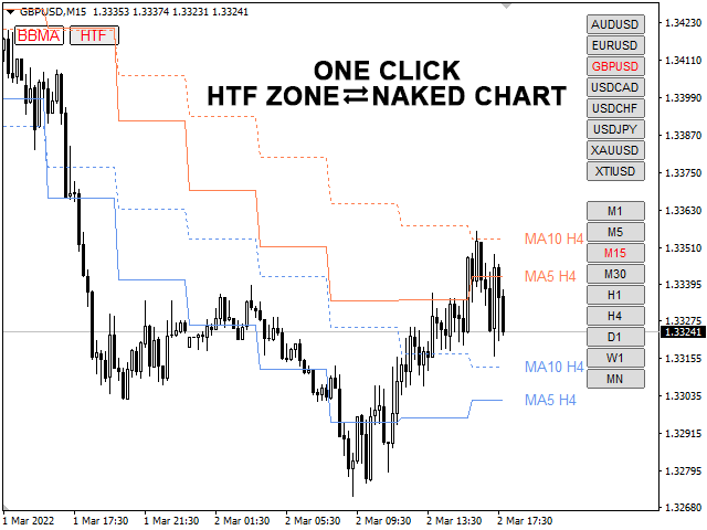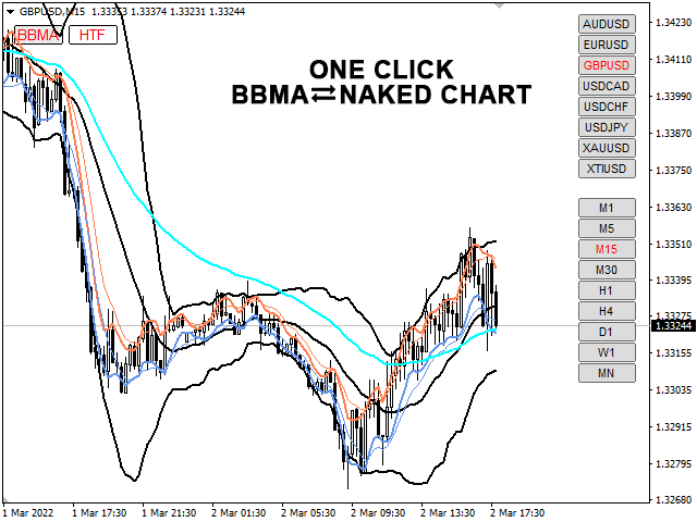 A customizable toggle indicator based on BBMA (Bollinger Bands & Moving Averages) trading system which allows traders to switch between BBMA & Naked Chart in one click, without having the need to change the chart template. Added ability to view higher time frame zones on a lower time frame chart, in one click, to assist traders on multi-time frame analysis.