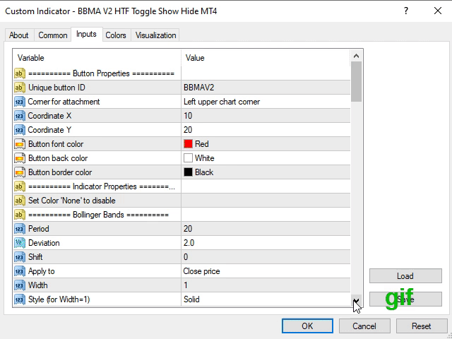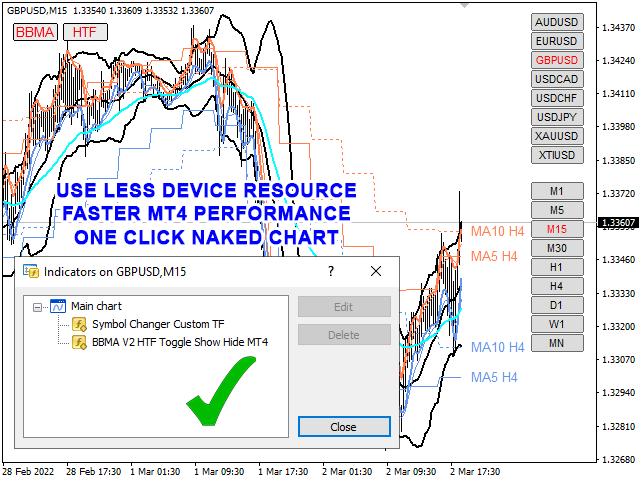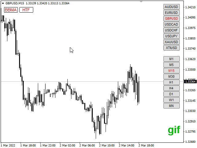 Customizable Indicator Parameter : Customizable toggle button (unique ID, position & style), 1 Bollinger Bands (parameter & style), 5 Moving Averages (parameter & style) & 4 higher time frame Moving Averages (parameter & style). Set Color parameter to 'None' to disable any specific indicator.