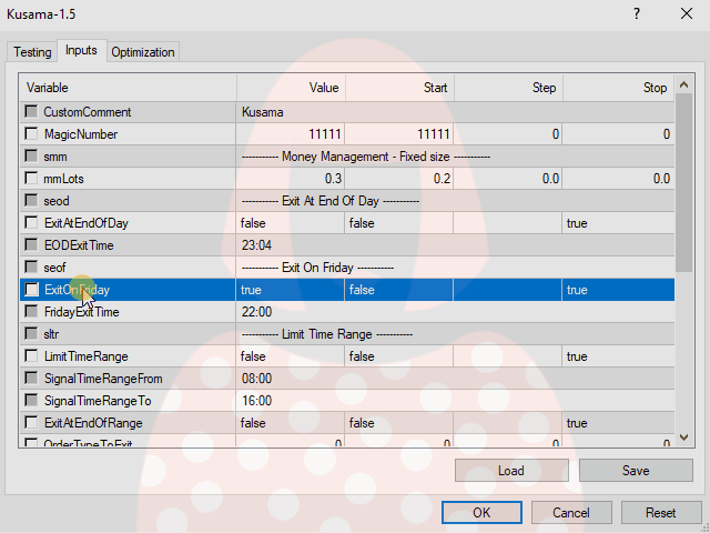 ExitOnFriday False If true - Close all positions on Friday FridayExitTime 22:00 Time of day