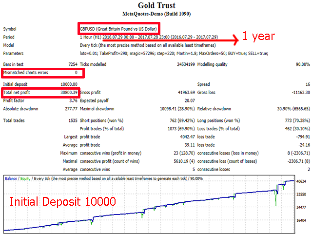 Gold Trust is a trading robot based on bidirectional martingale system. Buy and sell positions are opened simultaneously allowing you to make profit regardless of a trend direction.