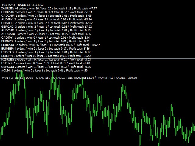 This indicator will help you to show ALL history trading statistics of any account you want. You just need to add it on any chart, and it will calculate important information from history of trading to help you to analyze trading result.
