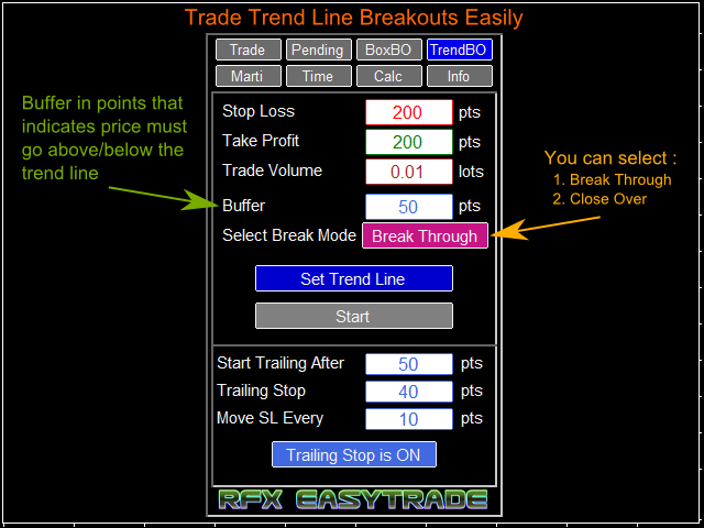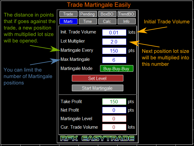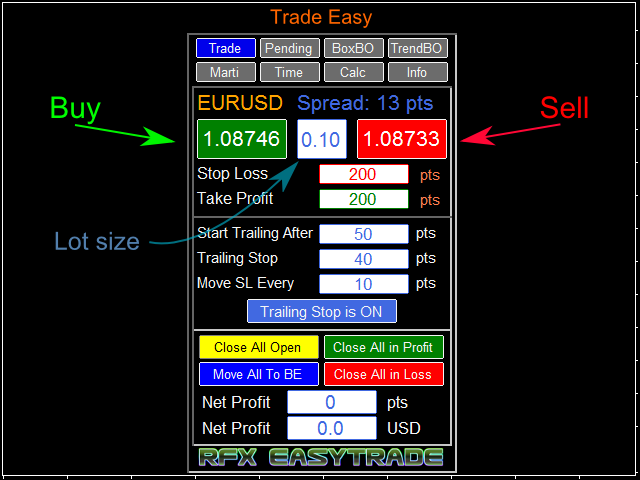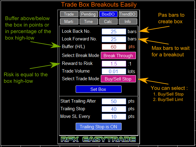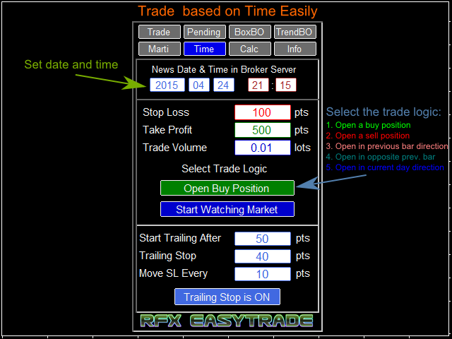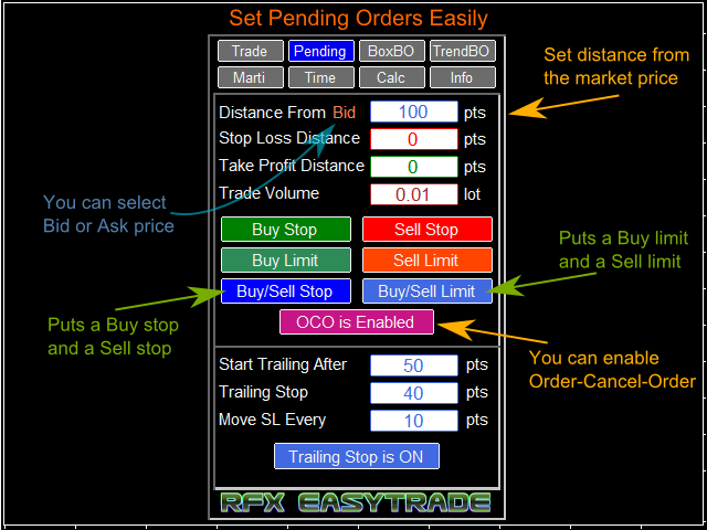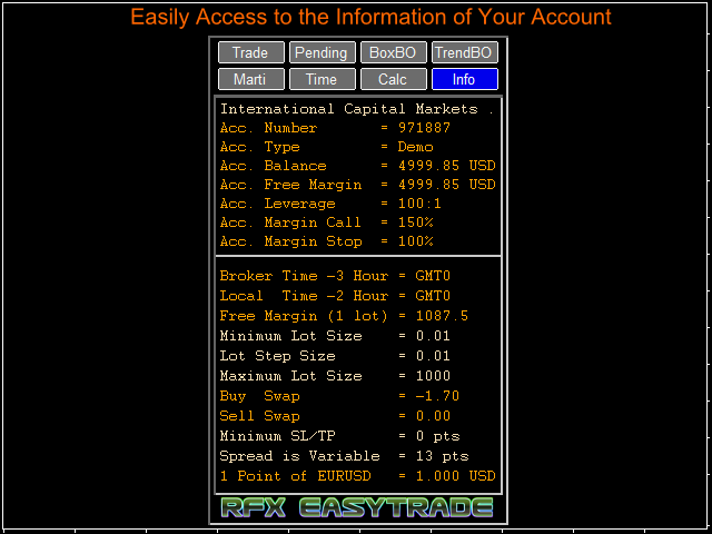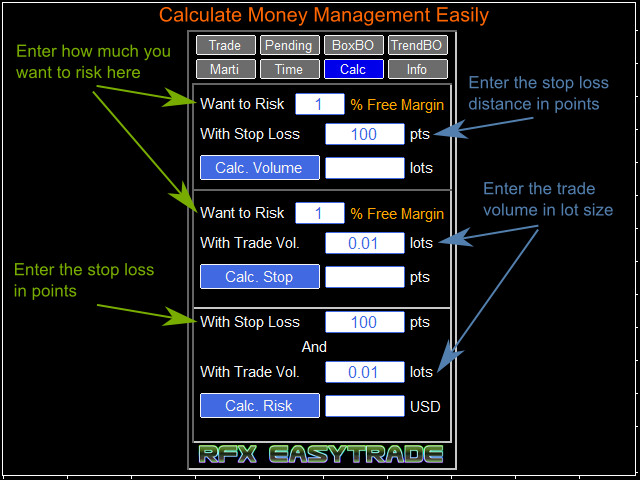 RFX EasyTrade is a professional panel to make your trades as easy as possible. You can perform scalping by acting fast and efficient. You can draw a box or a trend line and let RFX EasyTrade to catch a breakout and manage the trade automatically. You can set pending orders and set Order-Cancels-Order easily. If you are a fan of Martingale strategy just set a few settings on the panel and let RFX EasyTrade to automatically manage the trades. You can trade based on time without waiting long time watching the monitor! Just set the date, time and order action and a trade will be opened and managed automatically. There is a very simple to use but effective Money Management calculator that lets you calculate the risk, lot size and stop loss of your trades just by one click. Do you need to access the information about your trade and the currency pair trading? Just click the Info tab and you will see all information you need.