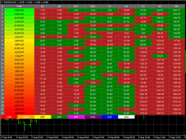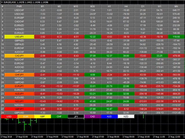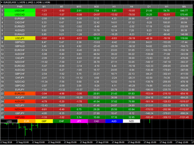 However, the pairs are then ranked VERTICALLY using a dynamic graded color code, transitioning from green, to yellow and to red in that order. The performance scores of the currency pairs in 9 timeframes are added together. The currency pairs are then ranked by their sum from the most positive to the most negative, and are color coded as follows: