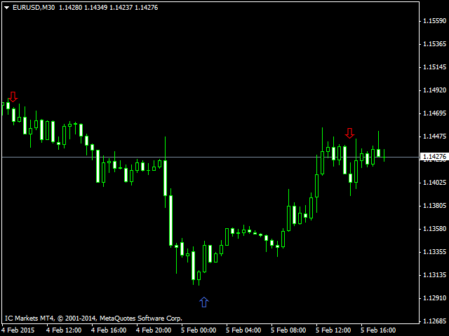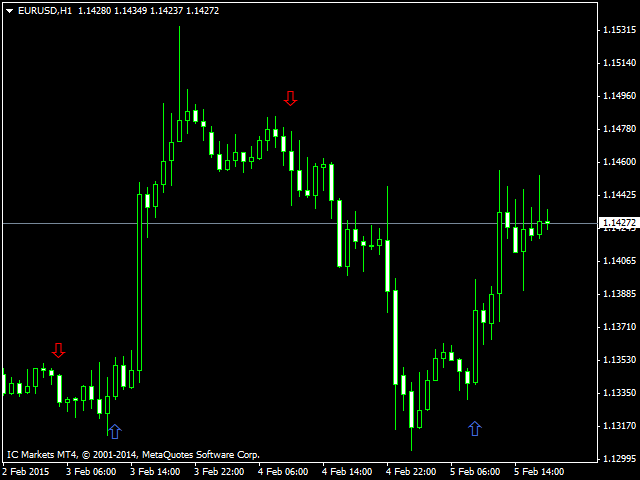 The indicator displays trend reversal in the form of arrows. The indicator does not change its values (is not redrawn) after a signal.