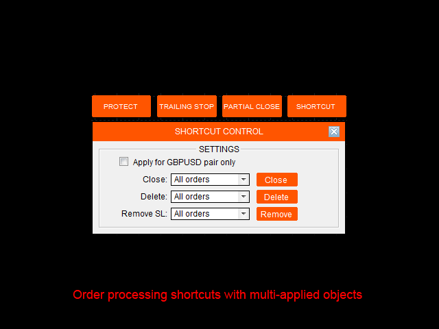 - For current pair check box: 选中此复选框,如果您只想在选择的当前货币对的订单上应用快捷。