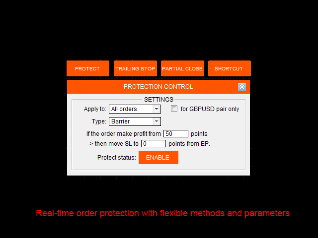 - Apply to: 选择哪类订单将得到保护,还有一些选项:所有订单,空单,多单,自定义单号,自定义魔幻数字订单,账户值。