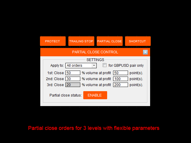 - Apply to: 选择哪类订单将应用部分平仓,还有一些选项:所有订单,空单,多单,自定义单号,自定义魔幻数字订单。
