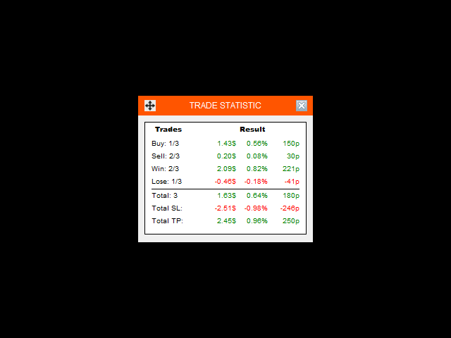 - 要查看交易统计面板,只要到设置菜单 - >显示交易统计。此面板可助您一览帐户某时间段的统计数据,其中包括做多单,做空单,盈利单,亏损单,总亏损和总盈利。