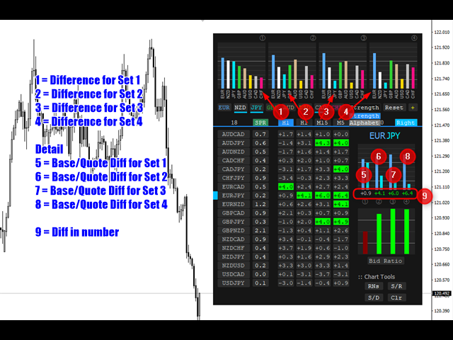 - Find symbols with difference in strength between Base currency and Quote currency in 4 calculation sets. The symbol's signal color of each set changes with difference in strength as defined in indicator settings [Difference in Threshold = 4]. The number can be changed.