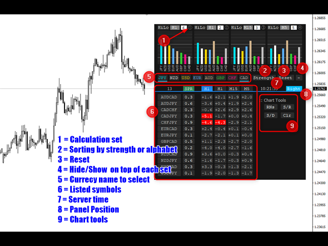 - Real-time multi-timeframe calculation from 28/34 symbols for strength of 8 currencies and XAU