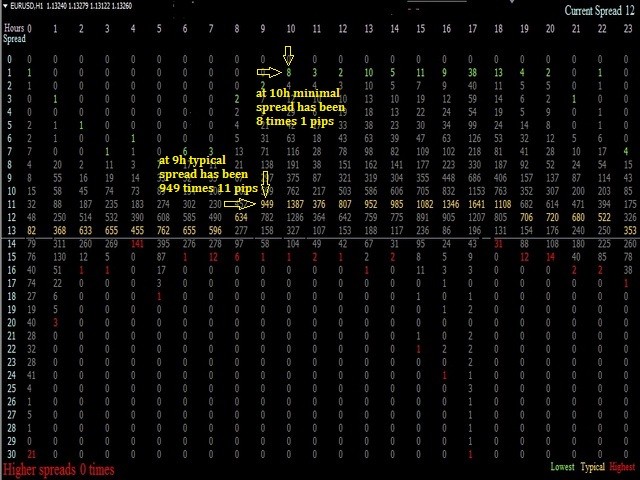 To select a broker for real trading. Create your demo account or real account with minimal funds in brokers between which you hesitate. Place the indicator and let it work more than one day and you will see spreads of every hour of the day and how many times they are repeated.