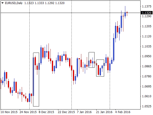 This is a multi timeframe indicator. The 'Time interval' parameter specifies a necessary time interval used when searching for inside bars. For example, you can launch two or more VAInsideBar indicators on М15 chart setting the 'Time interval' parameter for each of them separately. As a result, you can use the М15 chart to track inside bars formed at higher time intervals (Н1, Н4, D1, etc.). The VAInsideBarsTrader Expert Advisor based on the indicator has been developed.
