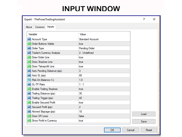 The Forex Trading Assistant is a trading utility that speeds up our execution of orders. The lot size is automatically computed based on the risk-on-balance you set in the input window. The pip value will be based on your risk-on-balance. Hence, the total stoploss is the actual risk computed based on your risk-on-balance per trade. Morever, you can drag your Order Line, Stoploss Line, and Takeprofit Line just like dragging a horizontal line on your chart. The following are the inputs.  ( Click DEMO LINK below to download demo copy.)
