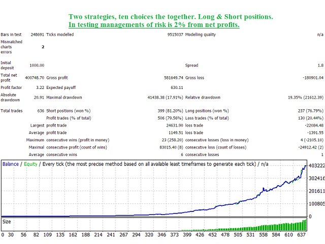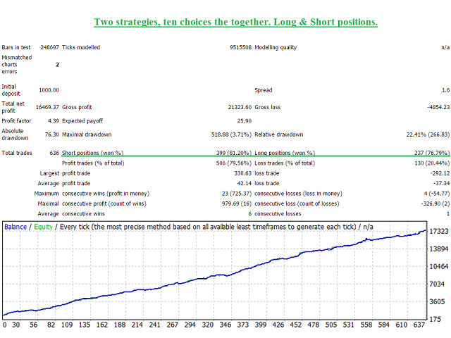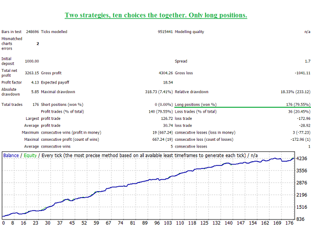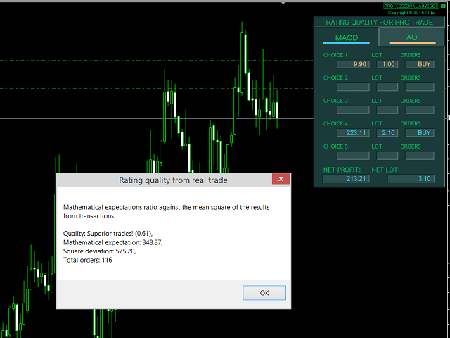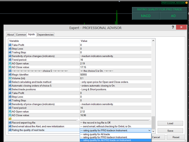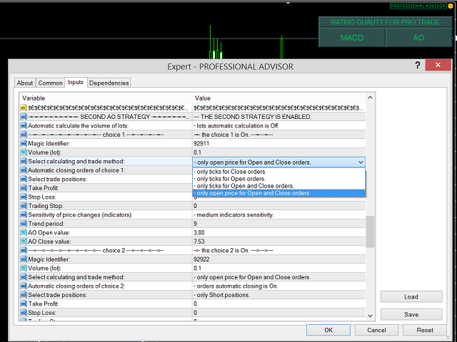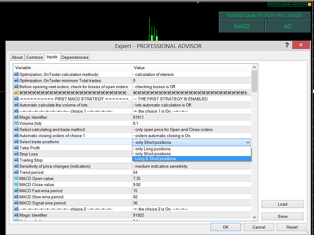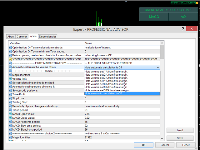 EA 被设计为“多重顾问”*。 它由十个独立的 EA 组成,这些 EA 使用流行的 MACD(移动平均收敛散度)、AO(很棒的振荡器)和 MA(移动平均)指标。 这是一种在一个 EA 中练习十种不同策略的能力。 如果您使用 MetaQuotes Software Corp. 的虚拟服务器进行连续交易,这也是一个最佳选择!