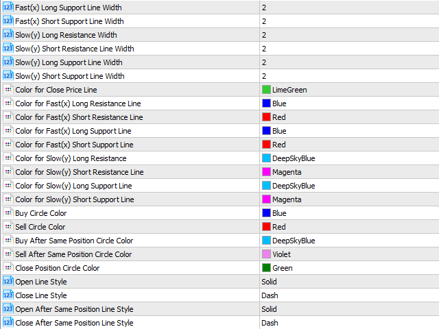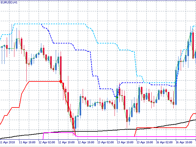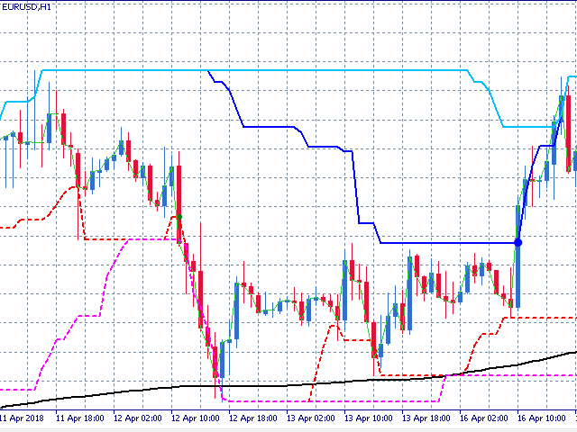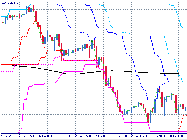 By default, the new position barriers are drawn as solid lines and the exit barriers are drawn as dashed lines. The new long position lines and the close short position lines are drawn in bluish colors, while the new short position lines and the close long position lines are drawn in reddish colors. There is also a second set of lines of longer periods used usually after the same type of position or an already successful position was closed.