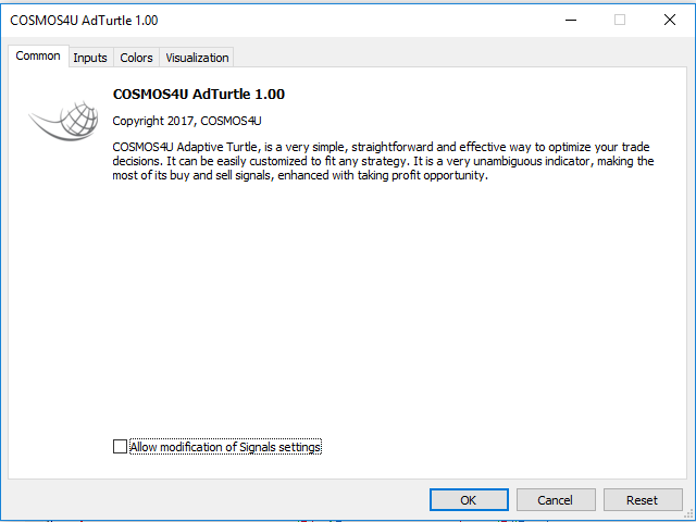 The COSMOS4U AdTurtle indicator is highly customizable, allowing you first of all to set the periods of new position lines as well as the dividers of those periods for the exit position lines. You can also customize the color and style of each individual line drawn on your diagrams.