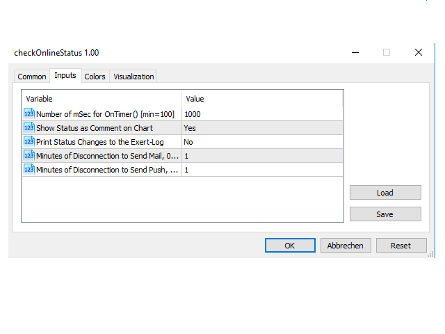 1. Number of mSec for OnTimer()[min=100] - To specify the time interval in milliseconds (mSec) after which Check Online-Status the online status is checked again. The minimum is 100 mSec, smaller values would unnecessarily overload the system. But remember that Check online status is activated by OnCalculate() (every new tick) and OnTimer().