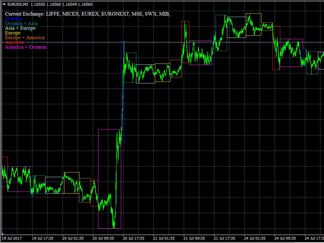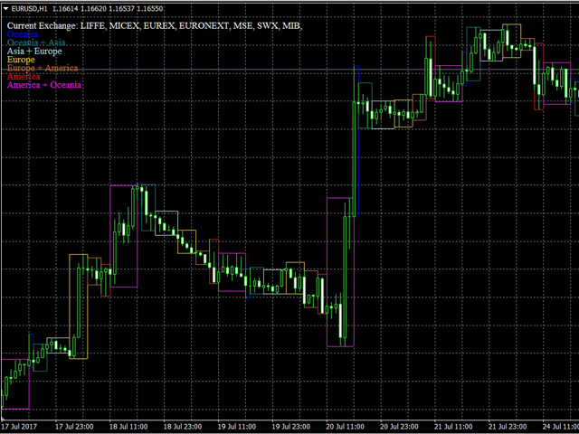 The ExchangeZone indicator displays the working time of the worldwide currency exchanges on the price chart.