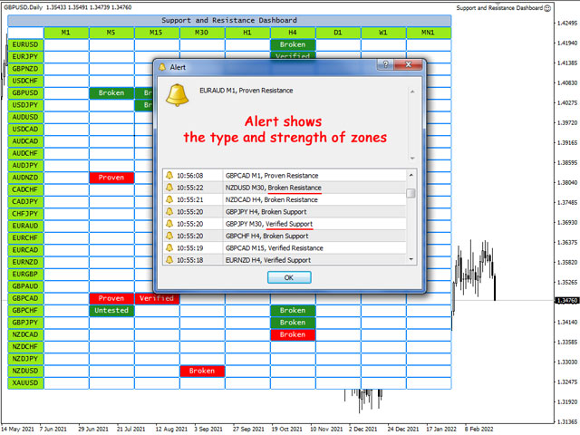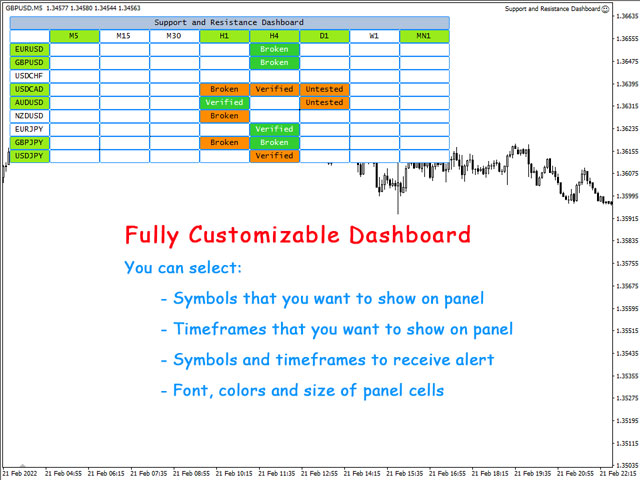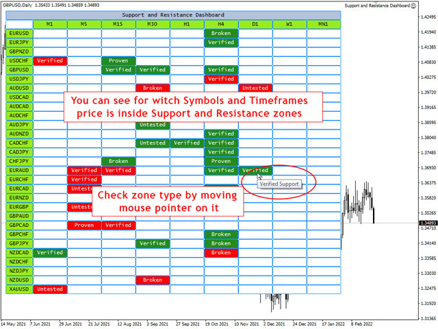 You don't need any more checking different symbols and timeframes to see if the price is inside the support or resistance zones, just run the dashboard and check the chart when an alert happens (you can select symbols and timeframes that you want to receive alerts).