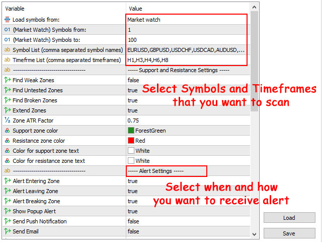 • You can set the parameters for support and resistance zones in dashboard input parameters.