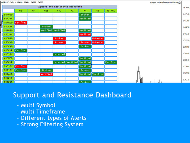 Support and Resistance Dashboard for MT4 is a multi-timeframe and multi-symbol scanner and alert system that finds S/R zones and pivot points for all timeframes and symbols and alerts when price has interaction with them.