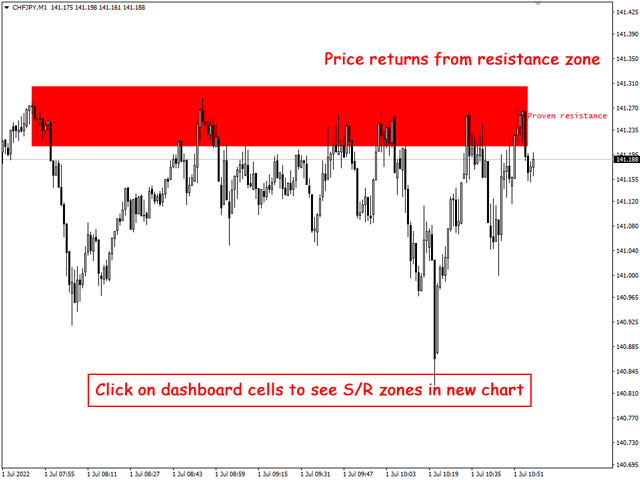• Dashboard shows if price has interaction with support and resistance zones from M1 to W1 timeframes for all defined symbols.
