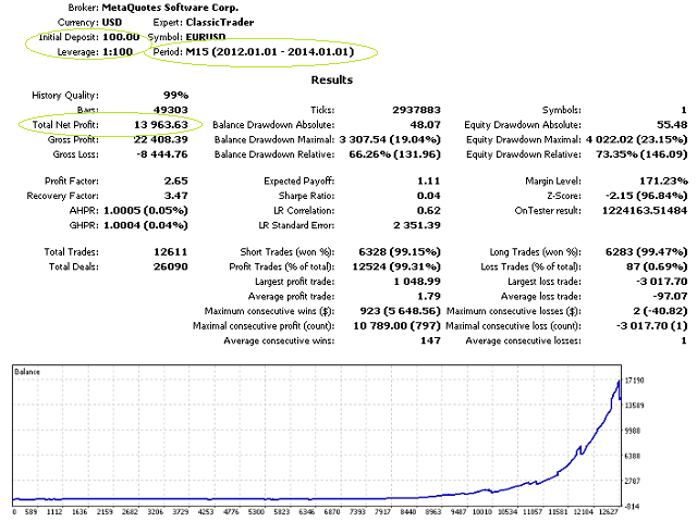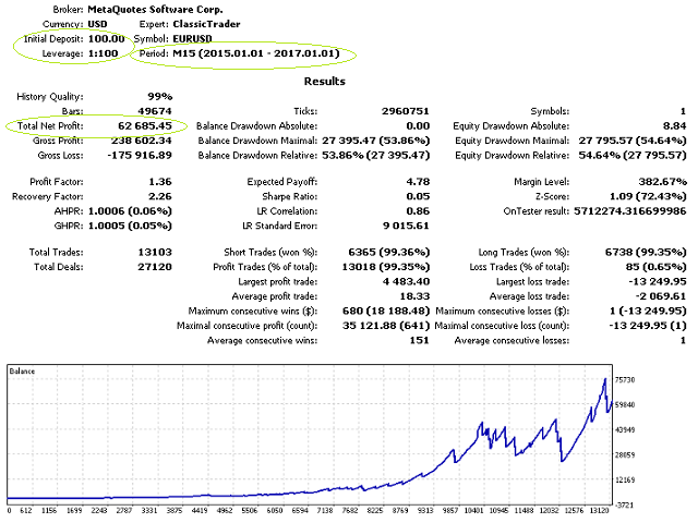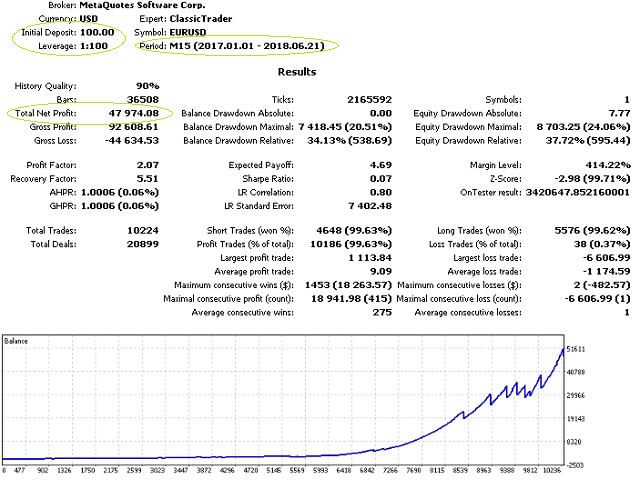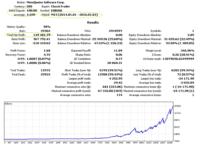 ClassicTrader is a universal and fully automatic Expert Advisor developed specifically for real Forex trading, which does not require any strict conditions or a specific broker. The minimum deposit is $100! The important advantage is frequent trading of large lots, which allows you to make additional profit on spread in partnership programs.