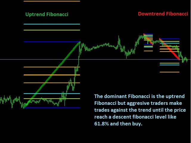 - On the graph, only the latest Uptrend and Downtrend Fibonacci chains are shown