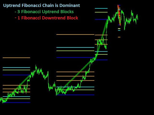 - Select the one that is dominant, i.e. the direction (uptrend or downtrend) that contains the most completed Fibonacci blocks in its latest chain.