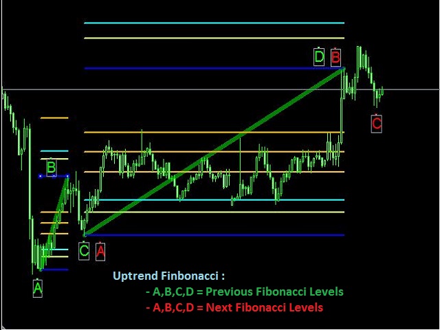 Fibonacci retracement is a method of technical analysis for determining support and resistance levels. The TSO Fibonacci Chains Indicator is different from a simple Fibonacci Retracements indicator in that it provides the targets for each retracement level. In other words, there is an Extension Level (D) for every Retracement Level (C). In addition, if an Extension Level is reached, then a new Fibonacci setup is created automatically. These consecutive Fibonacci setups create a chain that reveals very useful information about an asset and it helps to make better trading decisions.