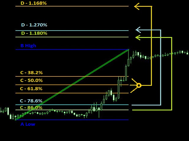 - C: Retracement (always at the lowest LOW (uptrend) or highest HIGH (downtrend) within the A-B range)