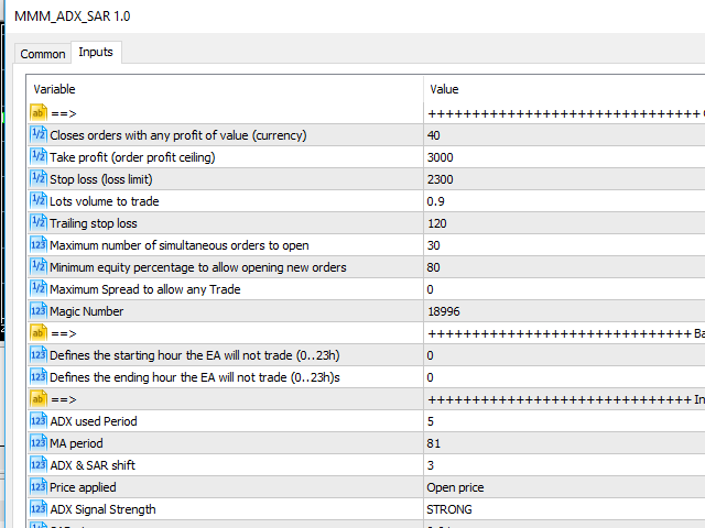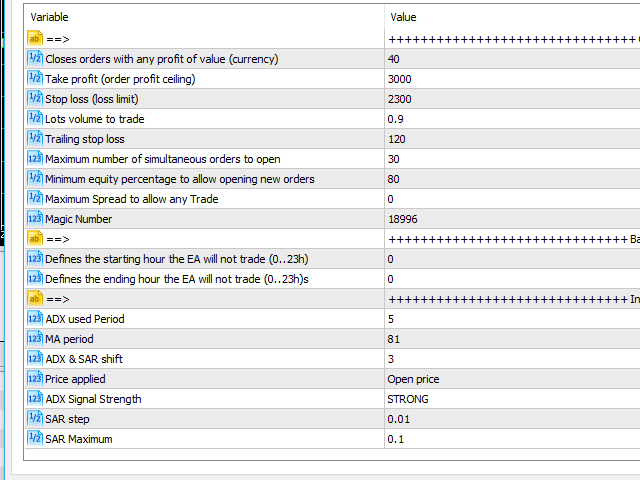 - As requested by some experienced traders, this EA's strategy uses its 3 built-in indicators to enhance its signals and decide to open a new order at the right time, there is an ADX indicator and you may choose its signal's strength, a parabolic SAR to help and confirm the trends and a MA to check if the prices are deviating from its patterns. By joining the 3 indicators' data, it is possible to calculate a good and strong trend direction, avoiding sudden market movements against your trading operations;