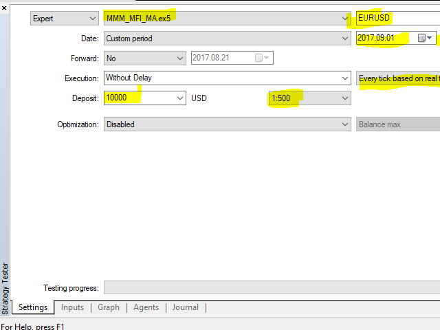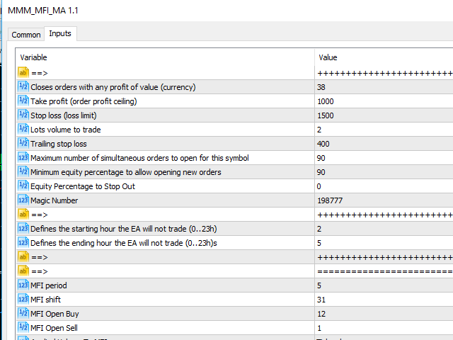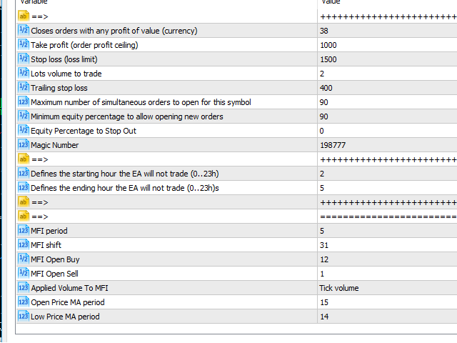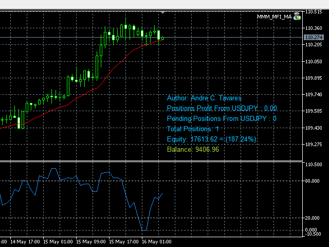 This Expert Advisor's main strategy is based on the usage of two kind of indicators: two built-in shifted MFI (Money Flow Index) to measure the asset prices oscillations and two Moving Averages calculated over Open Prices and Close Prices to confirm the trends. It combines these indicators signals in order to get stronger signals and ensure the EA will do good trading operations.