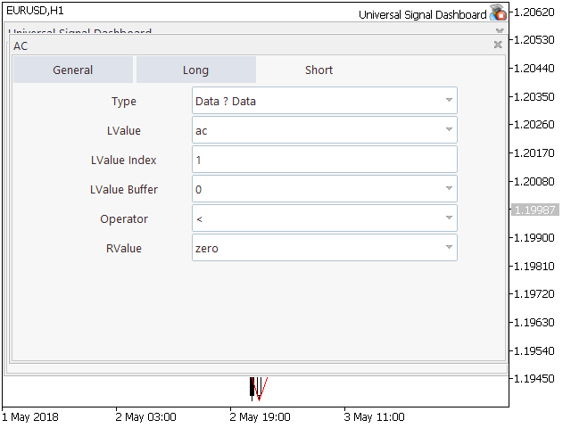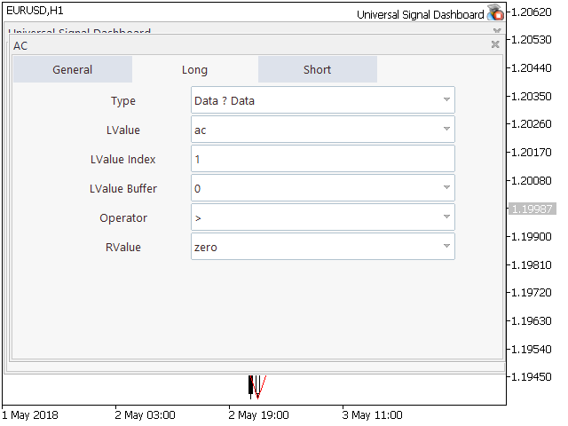 - On the sub-dialog, under the Long and Short tabs, specify the type of signal evaluation to use (other fields may appear as needed, depending on signal type)