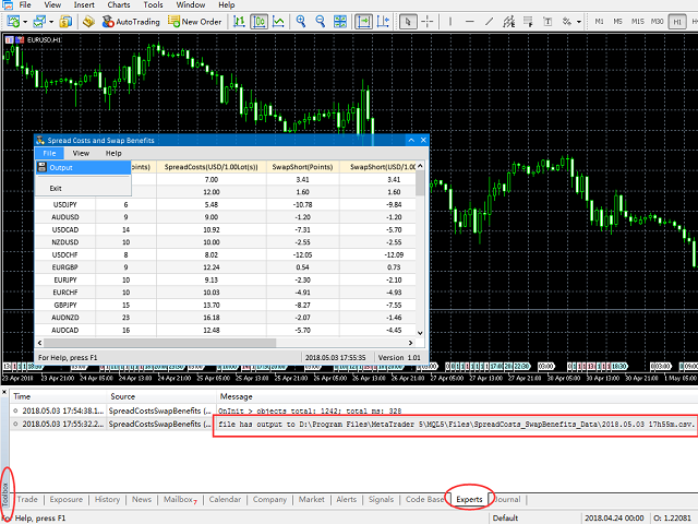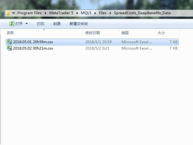 - 通过“文件->导出”选项将点差成本及隔夜息收益输出到文件中,输出的路径为“ MT5路径\MQL5\Files\点差成本和隔夜息收益数据 ”,文件名称是当前日期,输出成功后会在“MT5终端-工具箱-专家”一栏显示成功输出信息,输出路径、文件名称及文件内容见下图。