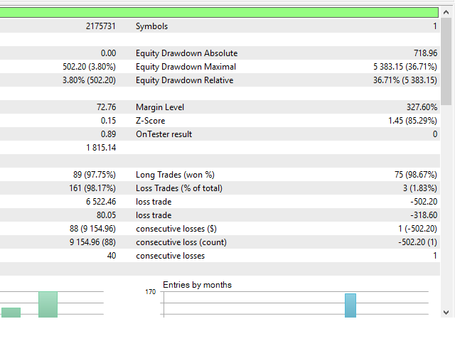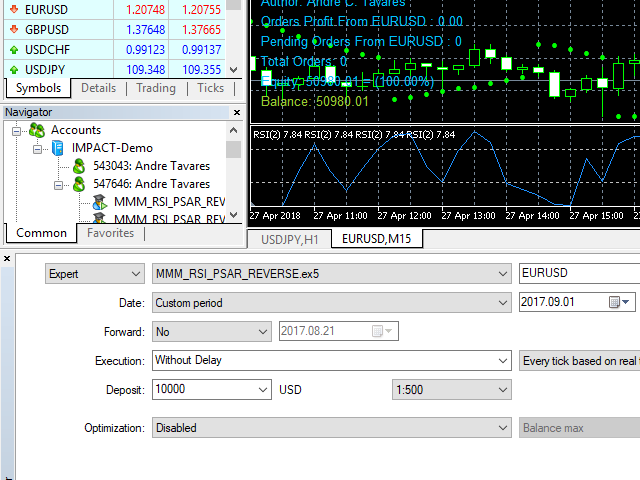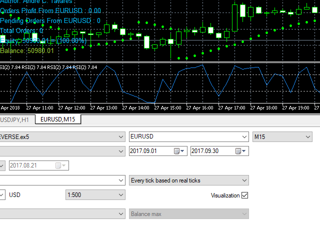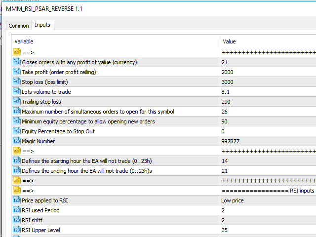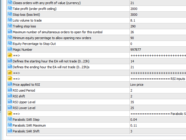 This Expert Advisor's main strategy is based on the usage of two kind of indicators: two built-in shifted RSI to measure the asset prices oscillations and a Parabolic SAR to check the prices trends. It combines these indicators signals in order to get stronger signals and ensure the EA will do good trading operations.